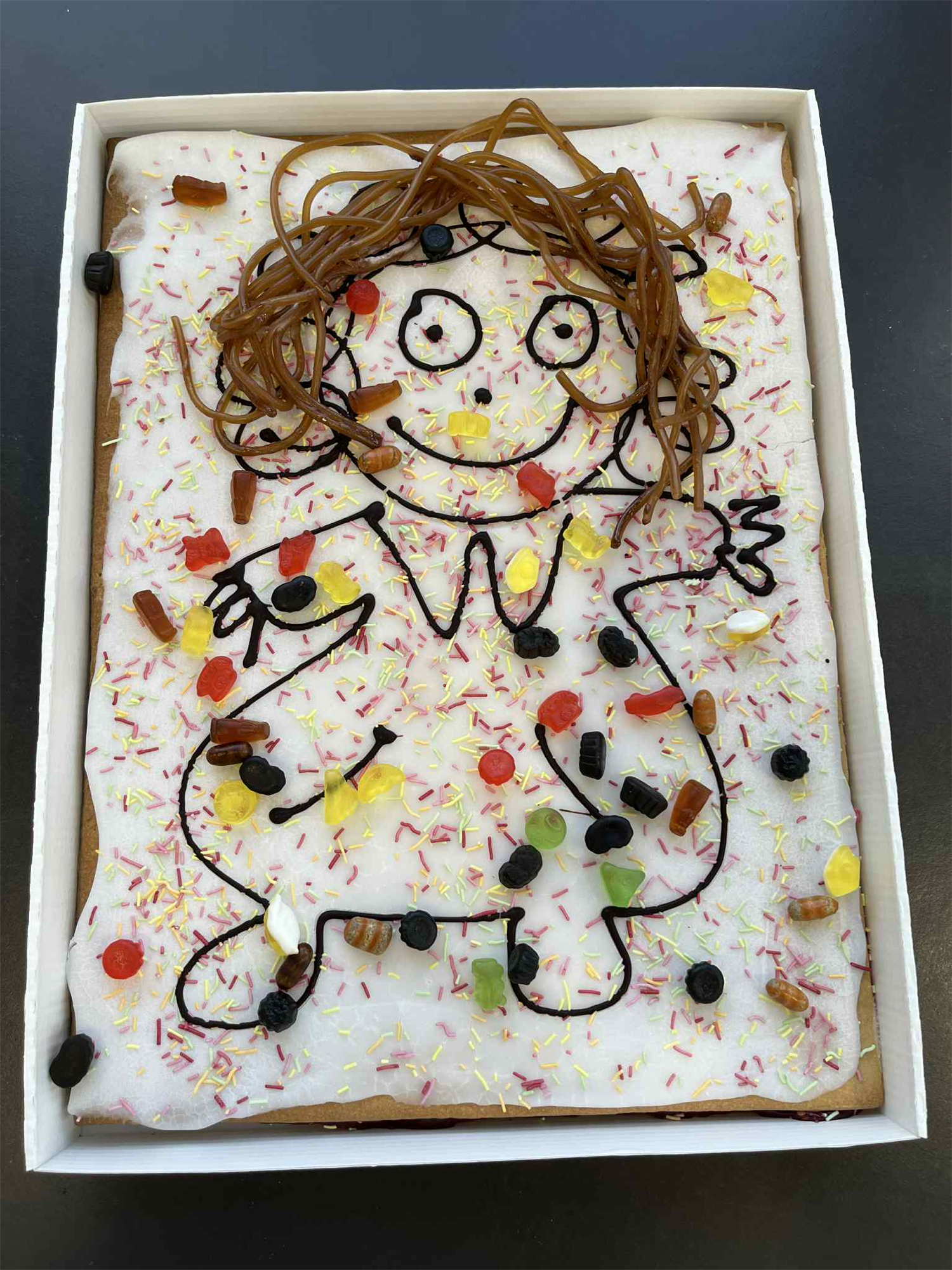 Pyntet med slik og glasur. Nok til 18-20 personer